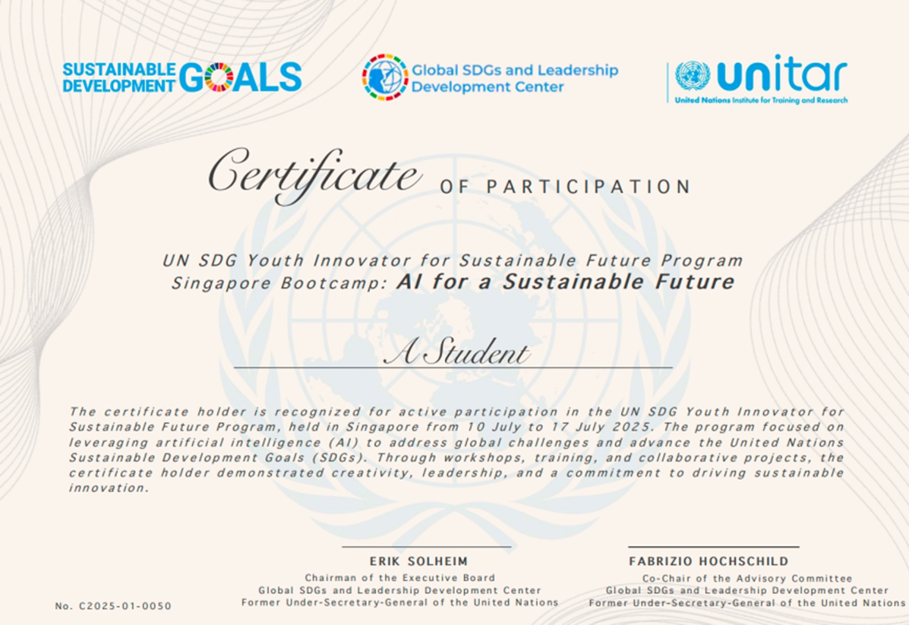 4、联合国训练研究所颁发的课程成绩证书:完成全部课程后,学员可获得由联合国训练研究所(UNITAR)颁发的官方课程成绩认证。
