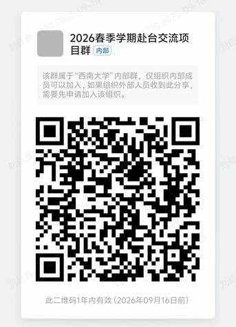 为丰富我校全日制在校学生的国(境)外学习经历,根据学校与台湾高校签订的校际交换生协议,现拟选派优秀学生以交换学生身份赴台湾高校参加2026年春季学期交换学习,欢迎感兴趣的同学报名参加。