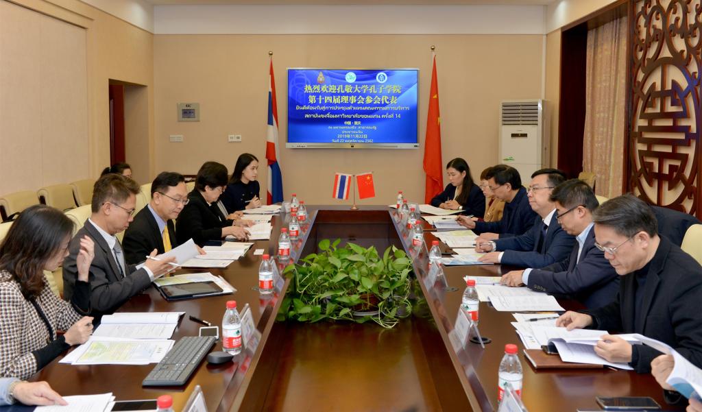 2019年11月22日,泰国孔敬大学孔子学院第十四届理事会在我校成功召开,副校长王进军教授出席并致辞,国际合作与交流处、人事处、财务处、国际学院、文学院等相关单位负责人参加。孔敬大学与会人员包括代理校长常才、主管教学的副校长密楚、教育学院院长苏玛丽、人文学院副院长查乐蒙、孔敬孔院泰方院长陈海楠、中方院长胡琳等。