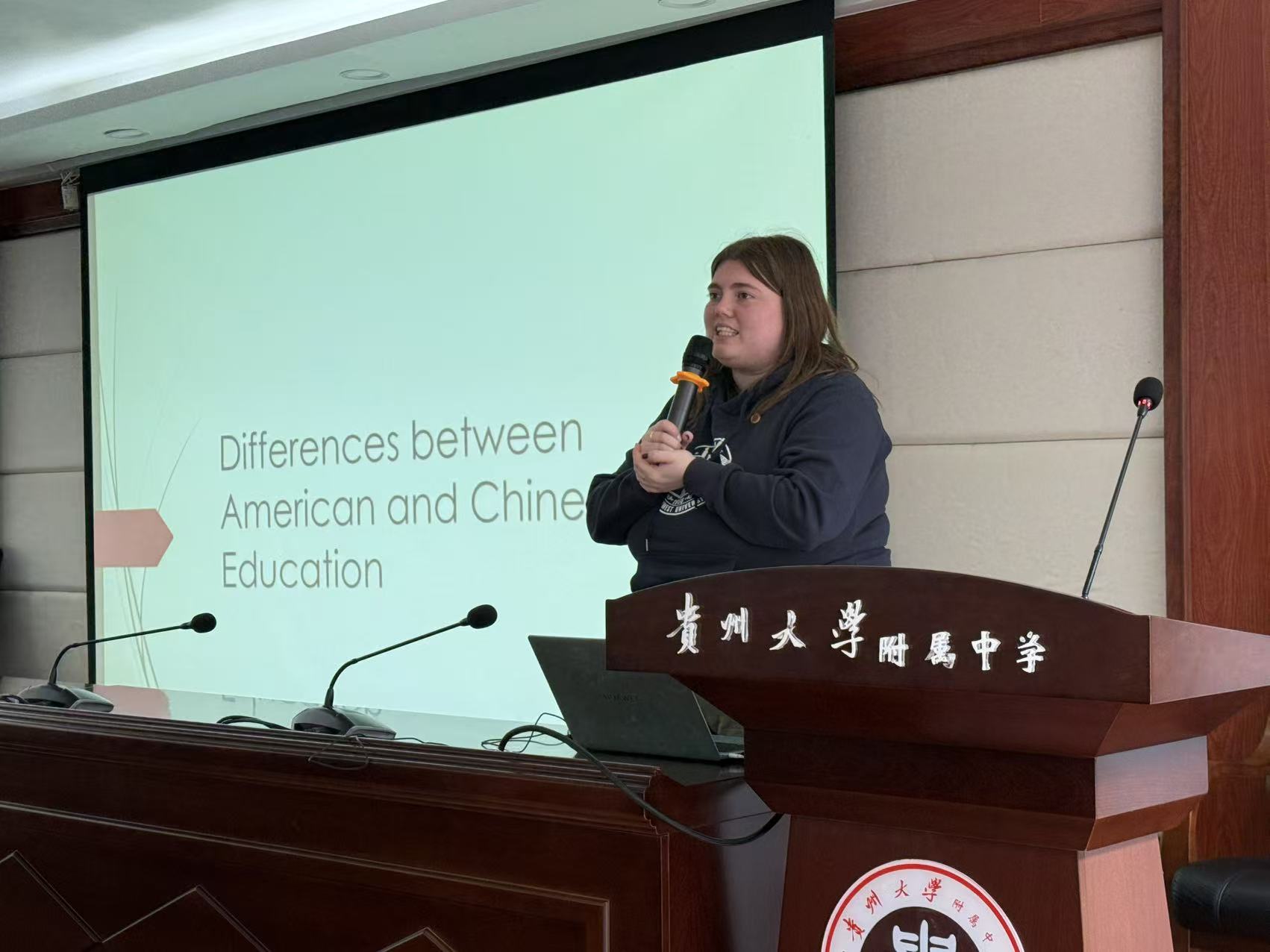代表团随后访问贵州大学附属中学,观摩了英语示范课并听取了英语组教师对附中办学历史、现状和未来发展的介绍。大家不仅对学校从德、智、体、美、劳全方位培育人才的教育理念深表认同,也对附中办学所取得的成绩留下了深刻的印象。我校外教代表Karissa给同学们做了“中美高中教育异同”的讲座,她勉励同学们努力学习,将我们共同的世界建设得更美好。所有外籍教师还与同学们进行了热情友好的交流沟通,为同学们在繁重的学习任务之中带去了一番不同的体验。