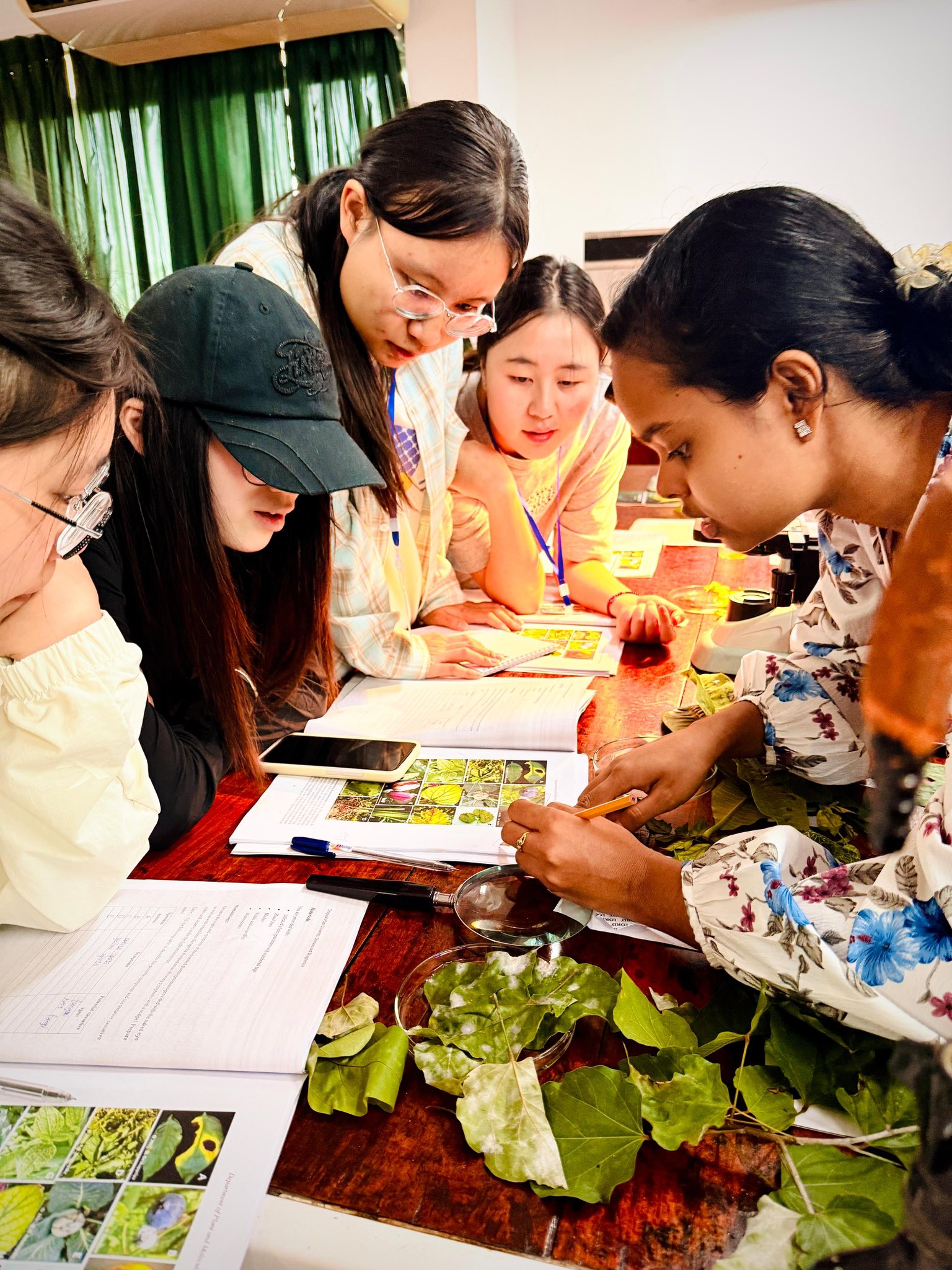 研学期间,学生系统参与了由凯拉尼亚大学精心设计的“热带植物多样性、病害与诊断”短期课程。课程内容涵盖植物病理学基础、病原分离与鉴定、分子检测技术及线虫防治等模块,理论教学与实验操作紧密结合。学生在校园内开展实地采样,在实验室完成真菌和细菌分离培养、DNA提取、PCR扩增及显微观察等操作,并通过实验报告、阶段测试和课题汇报,实现“学—练—思—用”的闭环式学习。