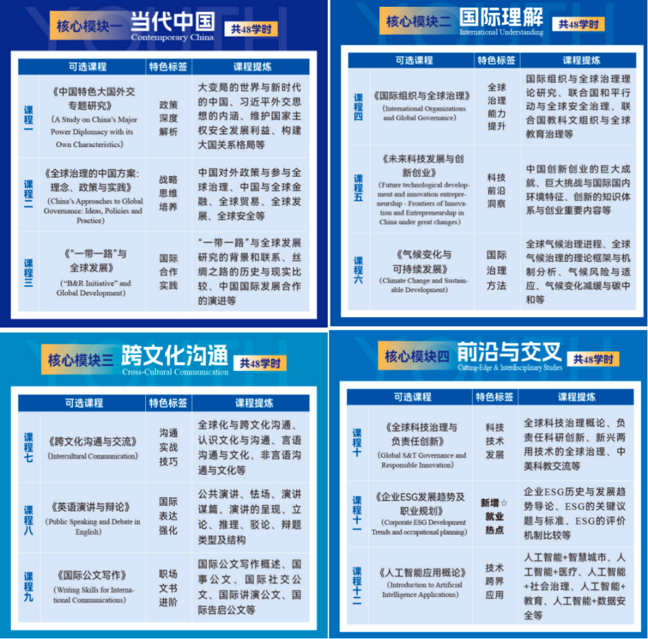 “新青年班”采用“课堂教学+实践活动”相结合的培养方式。课程资源包含12门核心课程、1门公益微课、至少9场系列讲座(线上线下结合、紧密围绕课程主题)、新青年工作坊、全球胜任力训练营、学术研究、国内教师研修;9项以上海外交流与实践活动(紧密结合课程)。课程内容包括“当代中国”“国际理解”“跨文化沟通”和“前沿与交叉”四大模块,课程总量不少于192学时。学生可根据研修中心要求并结合自身情况,灵活选择四大模块的12门核心课程。