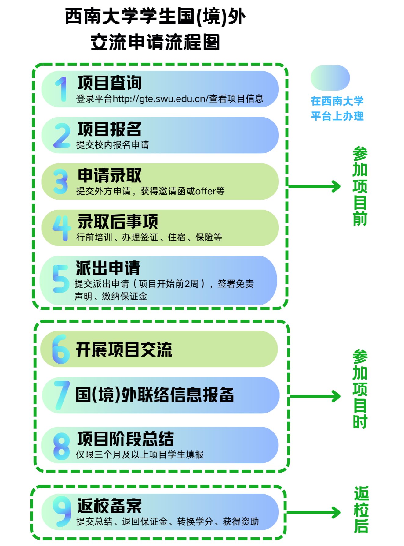 2.具体操作指南可登录平台-资料下载-《西南大学学生国(境)外交流申请流程》、《西南大学学生国(境)外交流项目学习总结要求 》等;