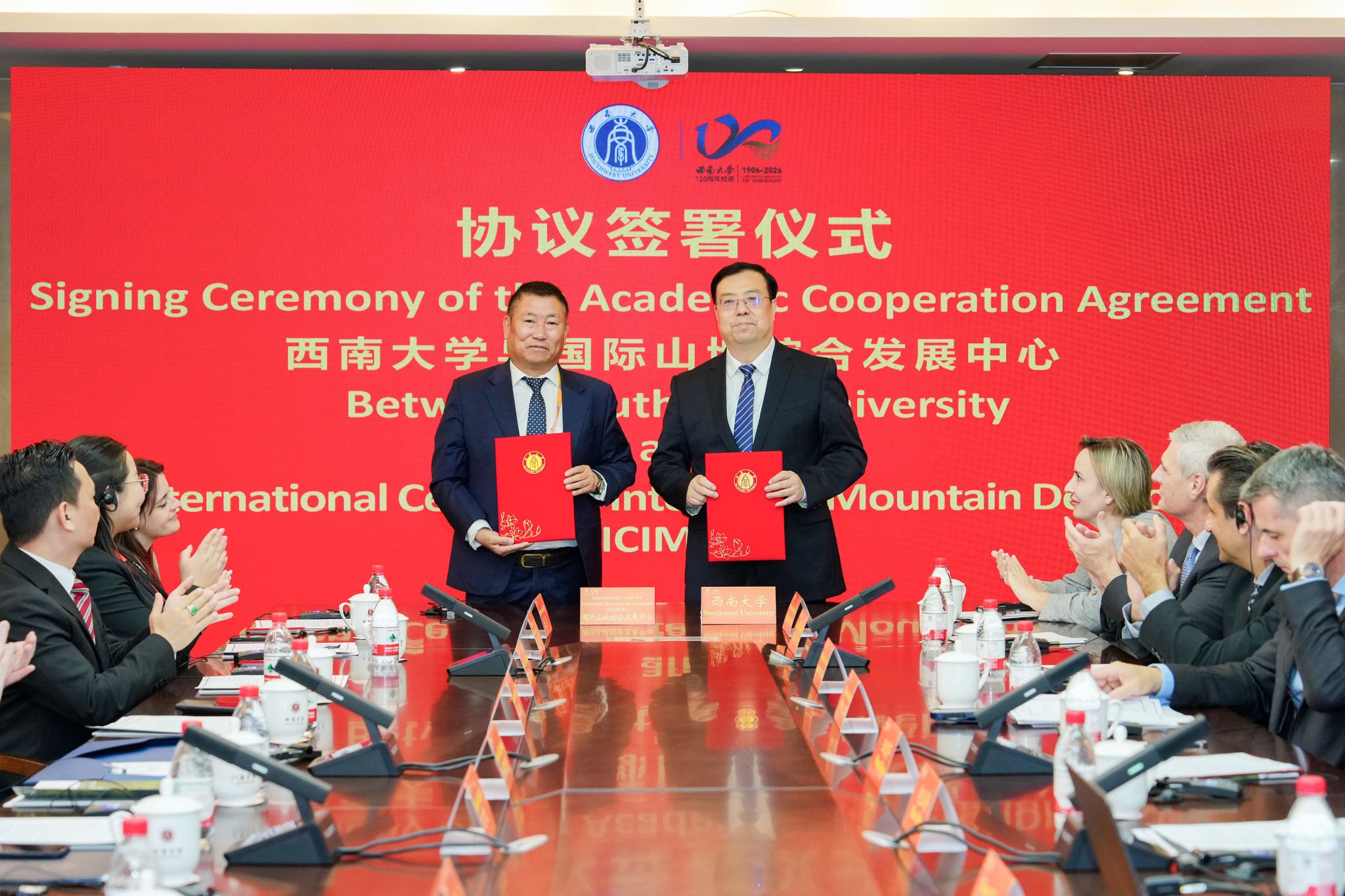 校庆期间,学校国际合作再结硕果,多项合作取得积极进展。在全体嘉宾共同见证下,王进军与国际山地综合发展中心总干事白马・嘉措现场签署《西南大学与国际山地综合发展中心学术合作协议书》。
