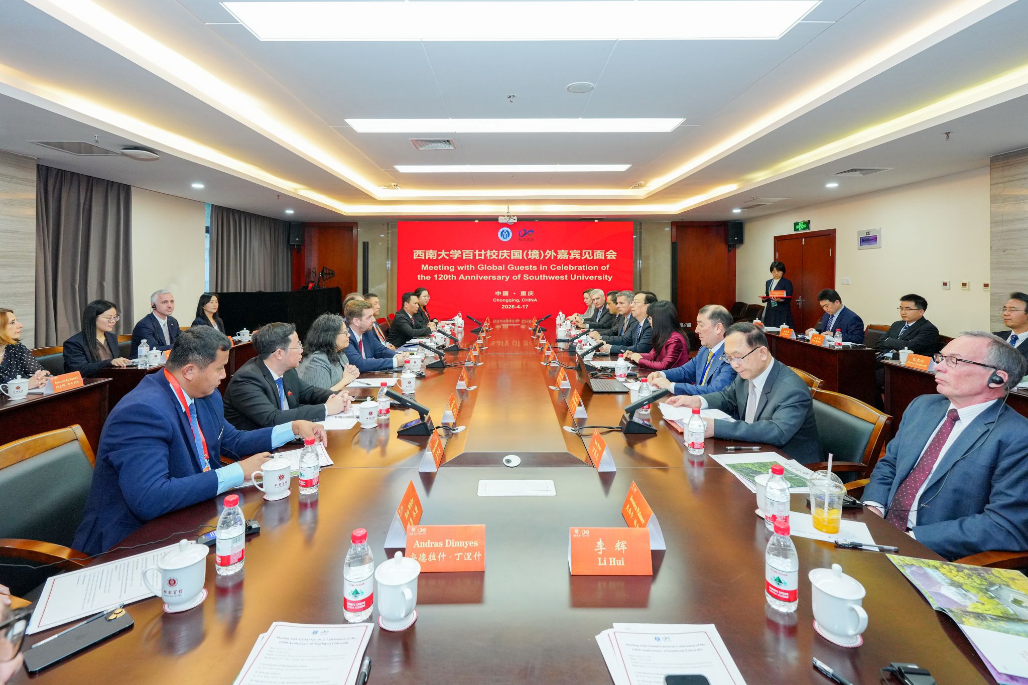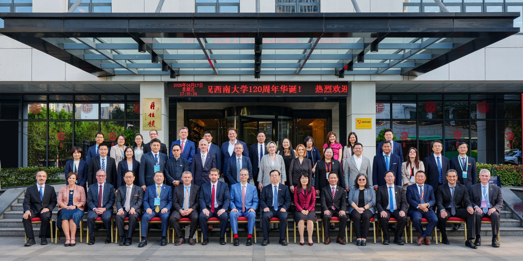 4月17日下午,西南大学120周年校庆国(境)外嘉宾见面会在学校桂园宾馆丹桂楼举行。希腊驻华大使,匈牙利、加拿大、缅甸、越南、泰国、柬埔寨、意大利等国驻成渝地区总领馆官员,以及匈牙利、哈萨克斯坦、泰国、澳大利亚、美国、新西兰等国家和港澳台地区友校代表齐聚缙云山下、嘉陵江畔,共贺学校百廿华诞,共商国际合作与人文交流新路向。校长王进军出席并致辞,副校长赵玉芳主持见面会。